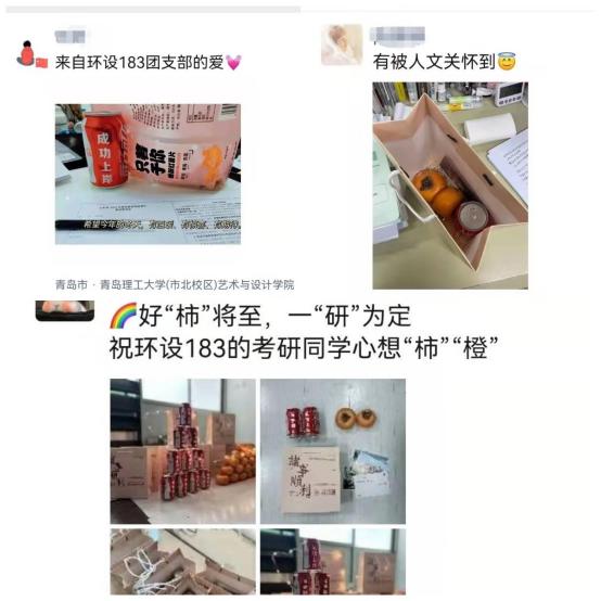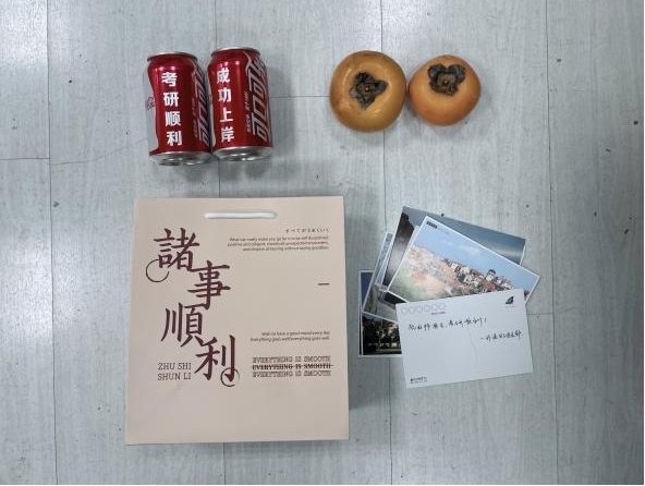 礼盒中的两个柿饼、甜甜的奶糖和印有“考研顺利”、“成功上岸”的可乐,寓意好“柿”成双、好“柿”将至、万“柿”如意、考研成绩“甜”在心里。除此之外还有班委会成员们亲手写的助力卡,每一张卡片都饱含着美好祝福。考研学子收到了班级送来的礼盒以及对大家的鼓励与祝福信后,纷纷“晒”到朋友圈表示感谢。