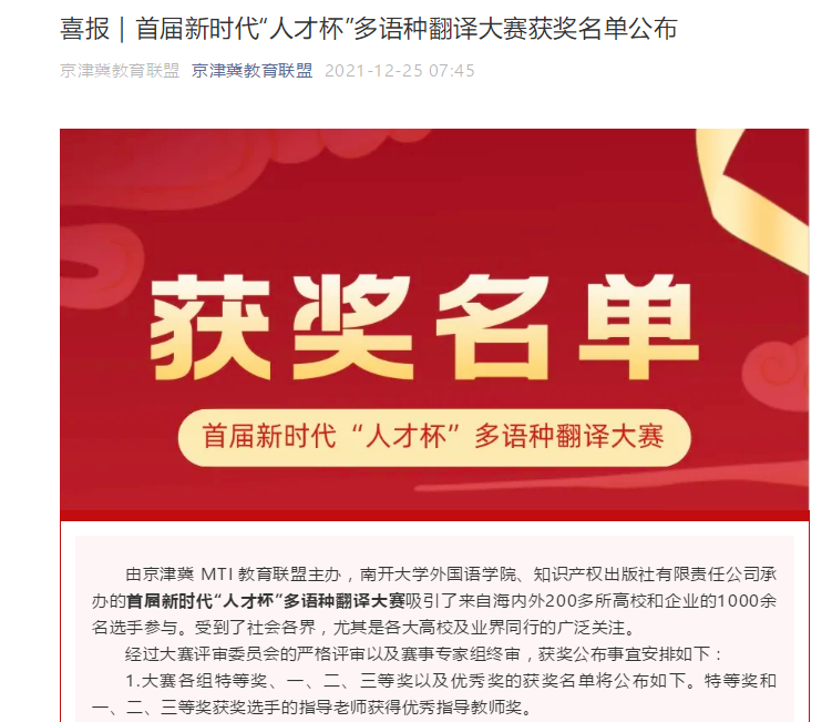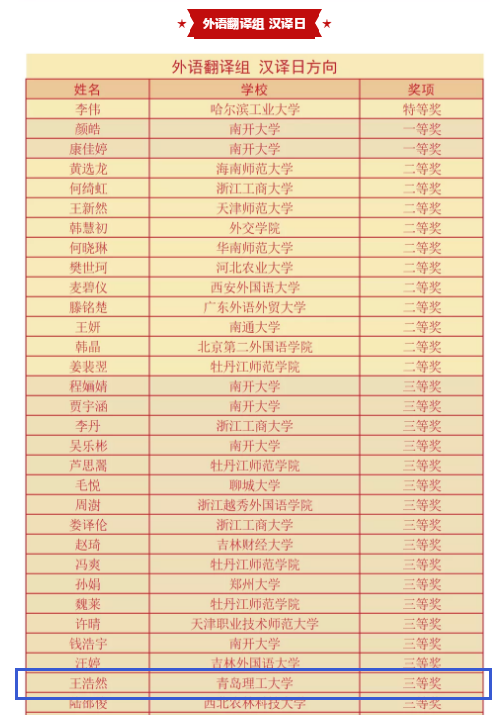 12月25日,首届新时代“人才杯”多语种翻译大赛公布获奖喜报。人外与外国语学院日语专业181班王浩然在外语翻译组中斩获日译汉二等奖、汉译日三等奖各一项,指导教师董世奎获优秀指导教师奖。