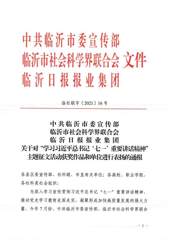 近日,由中共临沂市委宣传部、临沂市社会科学界联合会、临沂日报报业集团共同组织开展的“学习习近平总书记‘七一’重要讲话精神”主题征文活动成绩揭晓,临沂校区获主题征文二等奖1项、三等奖2项、优秀奖2项,临沂校区获“优秀组织奖”。