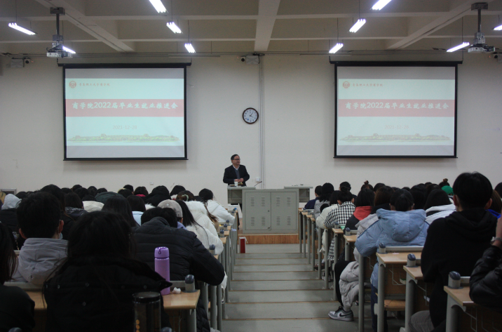 12月28日下午,商学院在学校第四报告厅召开就业动员大会,商学院党委书记王粲、副院长云乐鑫、党委副书记兼副院长李慧及商学院2018级全体学生参加了本次会议。