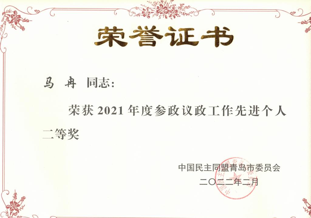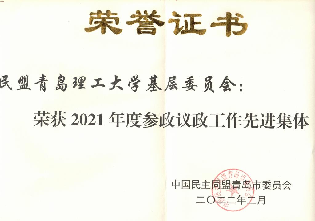 其中,民盟青岛理工大学基层委员会获“青岛市2021年度参政议政工作先进集体”,民盟青岛理工大学基层委员会副主委马冉老师获“山东省2021年度参政议政先进个人”和“青岛市2021年度参政议政工作先进个人二等奖”称号。