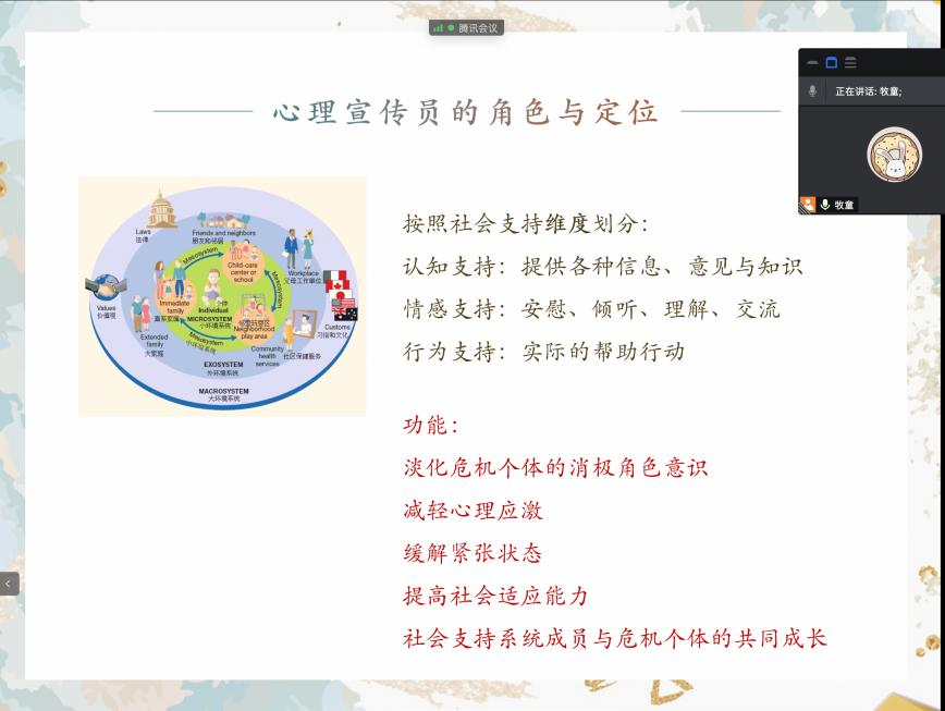 关注心理动态,开展心理健康教育。商学院立足加强疫情防控期间大学生心理健康教育,开展心理宣传员培训、学生团体辅导等心理“复位”系列活动。学院心理联络员于子淇从大学生常见心理问题的识别与应对、心理问题高发时间段与人群、朋辈心理辅导的技巧等方面入手,为全体心理宣传员开展线上素质能力培训。同时以“雨中人”绘画疗愈为主题开展心理团辅,引导学生自我觉察,纾解压力,将自己遭遇的压力和困境投射到纸面,并从中发现自己的情绪问题和人际问题,察觉自己习惯性应对压力的方式。有效筑牢四级预警防控体系,稳定大学生的社会支持系统。