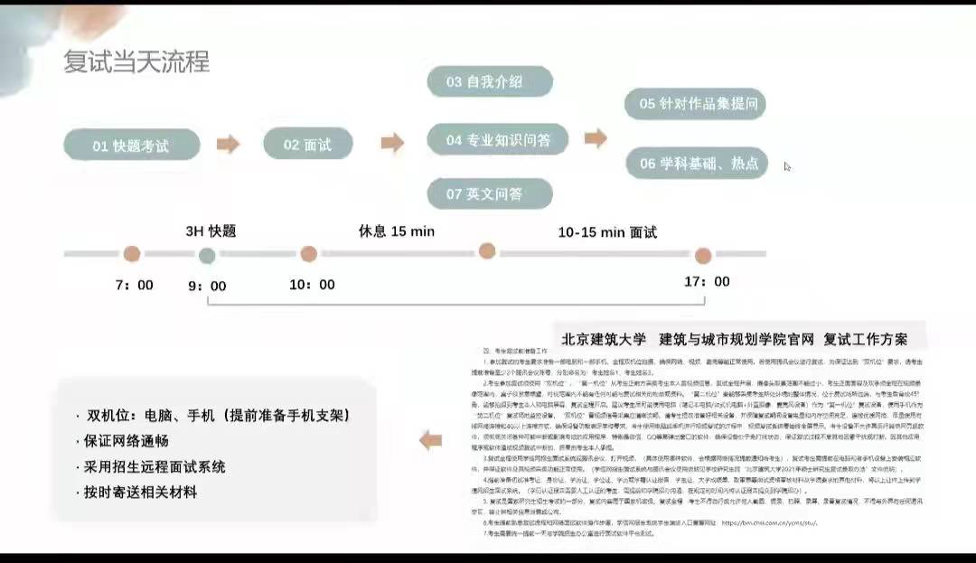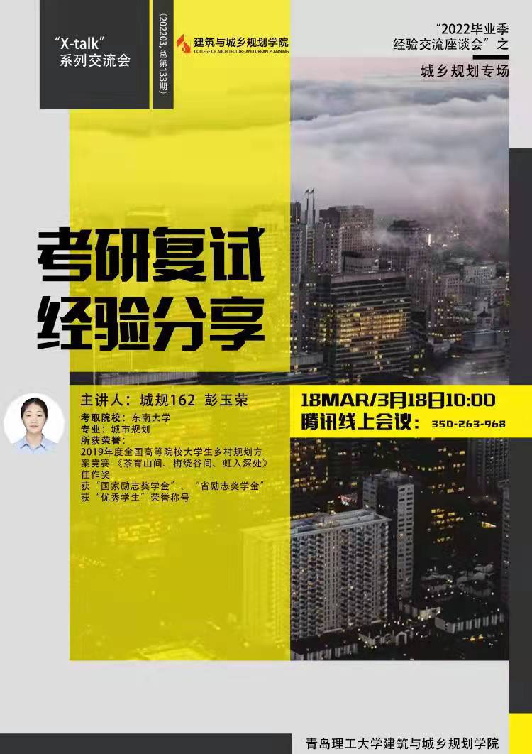 为帮助2022届考研学生熟悉线上复试流程,从容应对线上复试,3月15—19日,建筑与城乡规划学院分专业举办“X-talk”之考研复试经验线上交流会。学院邀请目前就读于北京建筑大学研究生肖涵岳、东南大学研究生彭玉荣等五位往届优秀毕业生担任主讲,学工办副主任、团委副书记杨霈宣,辅导员朱华建、张宇参加交流会。