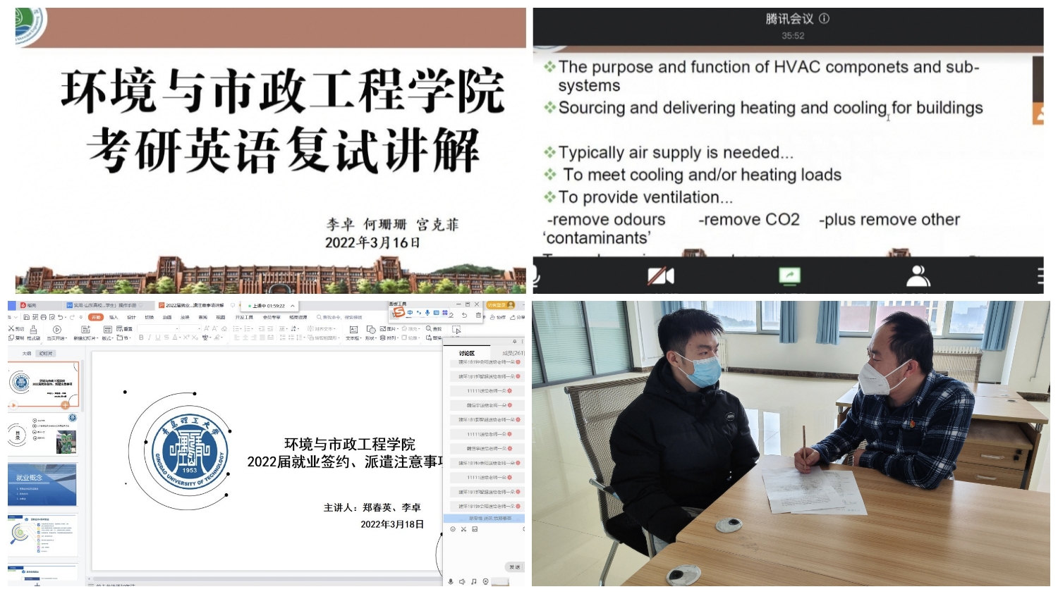 线上加线下,一起学起来。近期正处于研究生复试阶段,李卓、何珊珊、宫克菲发挥英语专业和硕博期间出国学习优势,在线上为2022届考研学子提供高效、实用的英语面试和专业英语复试指导,参与人次200余人次,并为有需要的同学进行线下一对一面试辅导,助力进入复试的同学们一“战”成硕。郑春英作为就业辅导员,为同学们讲授就业技巧,组织云端招聘会,助力学生就业。