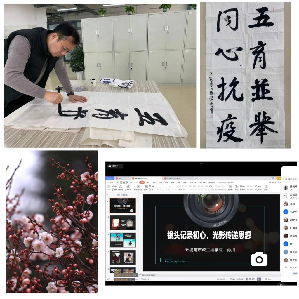 美育加专业,一起美起来。孙川发挥摄影专业优势,对同学们加强美育教育,为同学们开设《镜头记录初心,光影传递思想》讲座,覆盖学生400余人次,并组织“共抗疫情 共待花开”摄影比赛,呼吁同学们走出宿舍、走到校园,发现生活之美、感受自然之美;罗荣指导“环之音”合唱团唱响《和光同尘》,展现青春力量,为抗击疫情加油,为党的二十大和建团100周年献礼;学院党委副书记、副院长隋学智也积极参与到“五育”课堂中来,组织同学们通过书画作品为抗击疫情加油。