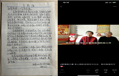 线上家书传家风,家校共上疫情思政课。家长会后,商学院开展“奶奶讲过的故事”“线上家书讲担当”等活动,鼓励学生家长以线上书信、微视频等方式进行家风教育,要求学生遵守学校各项规章制度,形成集体精神和规则意识,鼓励学生疫情中主动作为,展现奉献精神和担当意识。学生家长纷纷响应,财管206班王同学家长专程发来支持信,向无私奉献的学校教师致敬和感谢。财管195班王同学奶奶则录制微视频,对孩子在学校学习生活表示安心放心的同时,也鼓励自己的孩子主动担当,在学校疫情防控工作中发光发热。