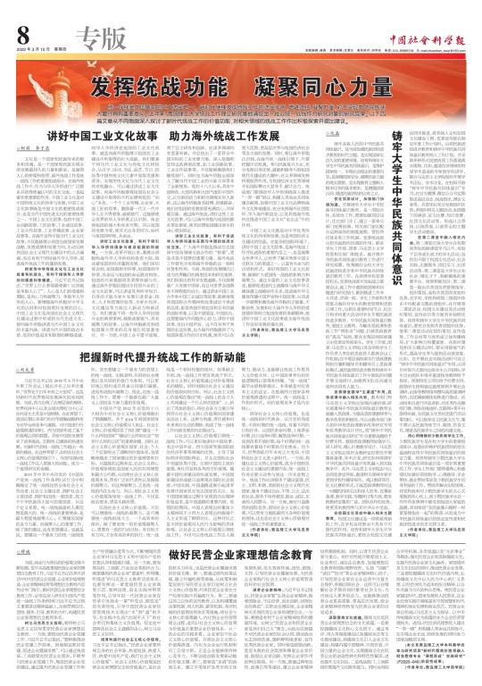 统一战线是中国革命取得胜利的三大法宝之一。新时代继续发挥统战工作的法宝作用,凝聚人心,汇聚力量,对于实现中华民族伟大复兴具有重要意义。对于如何发挥统一战线的功能和作用,凝聚同心力量,画好新时代统一战线最大同心圆,我校统战工作理论研究基地研究人员从不同侧面进行了理论思考和阐述。3月10日,《中国社会科学报》整版刊发了我校统战工作理论研究基地研究人员撰写的四篇理论文章,中国社会科学网同时以“发挥统战功能 凝聚同心力量”为题进行了专题报道,链接地址为:https://epaper.csstoday.net/epaper/read.do?m=i&iid=6255&eid=43605&idate=12_2022-03-10。