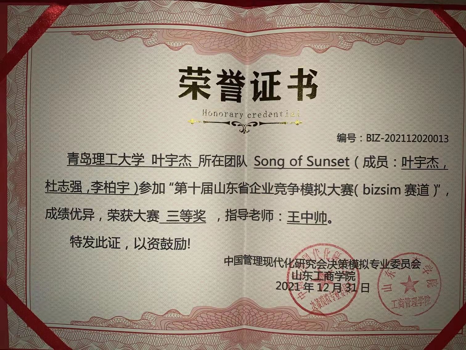近日,由高等学校国家级实验教学示范中心联席会指导,全国高校教育技术协作工作委员会、中国管理现代化研究会决策模拟专业委员会共同举办,山东工商学院承办的2021年山东省企业竞争模拟评审结果公布。管理工程学院两支代表队,从全省80支参赛队伍中脱颖而出,赌神队(队员:闫文宇、于海恒、李欣然)获一等奖,Song of Sunset队(队友:叶宇杰、杜志强、李柏宇 )获三等奖,王中帅获评优秀指导教师。