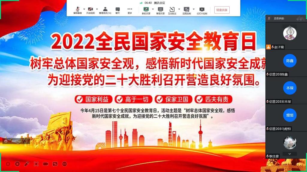 各团支部召开“全民国家安全教育日”主题团日活动。4月14日,学院各团支部组织开展“全民国家安全教育日”主题团日活动。各班团支书通过带领同学们集体学习《中华人民共和国国家安全法》条文和观看国家安全教育视频向团员青年们阐释国家安全的含义,让同学们进一步了解国家安全知识相关概念,让国家安全常识深入人心。团员学生们围绕此次国家安全知识学习畅谈心得体会,深入交流自己对国家安全的理解。信管203班赵子龙谈到:“作为新时代共青团员,应成为维护国家安全的中流砥柱,深入学习贯彻总体国家安全观,增强忧患意识,为维护国家安全贡献自己的知识和力量”。