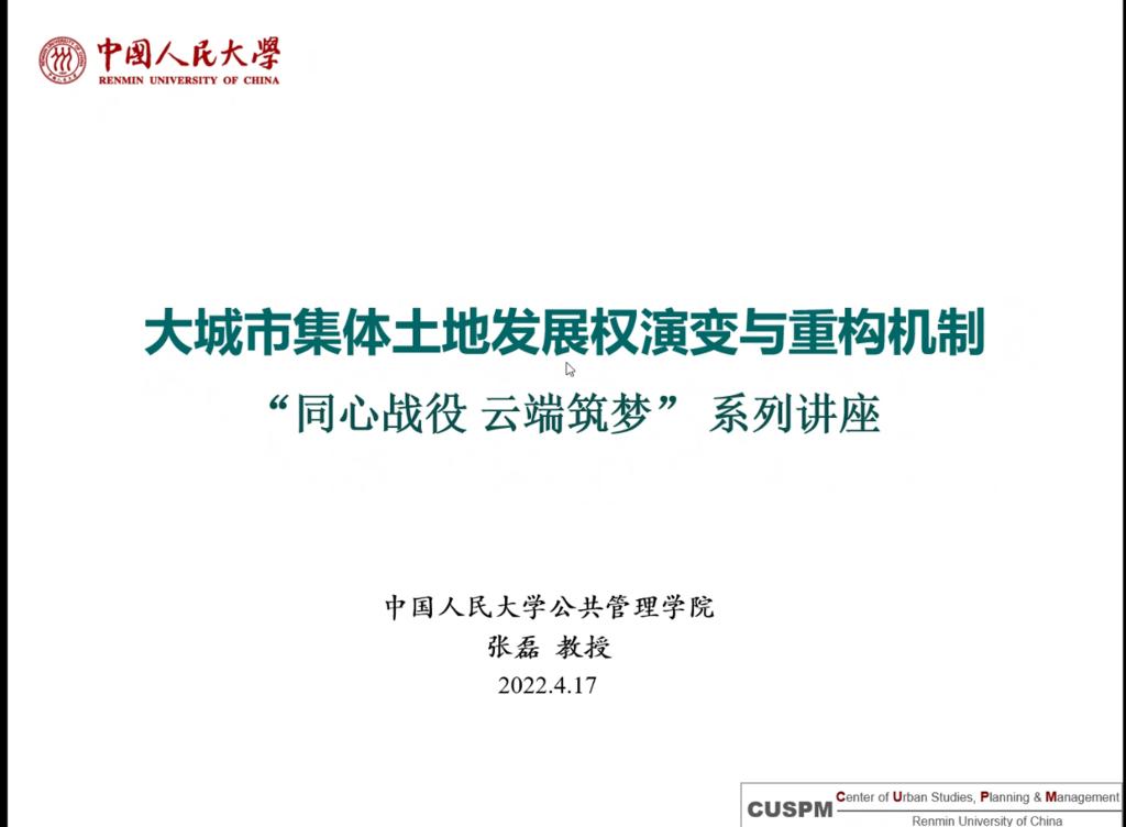 为丰富学生文化生活,提升学生学习的积极性与主动性,4月17日晚七点,建筑与城乡规划学院开展“云端筑梦 学术联动”——大城市集体土地发展权演变与重构机制专题讲座。中国人民大学公共管理学院教授张磊主讲,报告由学院韩青教授主持。