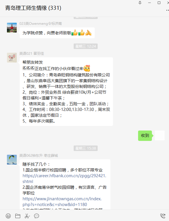 校友反哺来送岗,人文关怀办实事。充分发挥广大校友的作用,在校友群众发布《致人文与外国学院校友的一封信》,校友们收到信后反映热烈,目前已经有广西、青岛等地校友推荐工作岗位,有四家校友企业发来招聘信息。