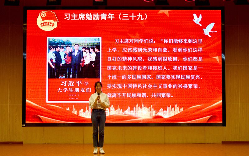 物本212李奕霏动情地向同学们分享到:“沐浴在和平与希望的阳光下,我们这一代青年学子享受着国家提供的优质教育资源,更应时刻践行自身的使命担当,勇敢地打败生活、学习中的困难,努力学习,报答亲人,回馈社会。用自身的光和热耕耘希望,踔厉奋发,砥砺前行,承报国之重任!”