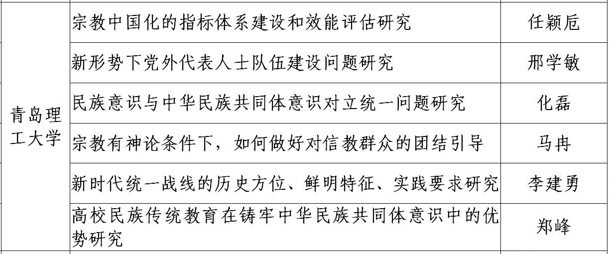5月13日,市委统战部印发《关于公布2022年度全市统战理论政策研究课题立项名单的通知》,我校任颖卮教授的《宗教中国化的指标体系建设和效能评估研究》等6项课题获批立项。