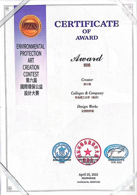 作为一项国际性的公益类设计赛事。比赛自2021年10月启动以来,在中国、美国、加拿大、新西兰同时开赛,涉及视觉传达设计、工业产品设计、环境艺术设计,并强调材料重组、绿色环保等新型创作方式。凭借创意独特、主题鲜明的作品,临沂校区土木与建筑工程系教师郑小强提报的《地球家园正在一点点开裂》荣获银奖,《父亲的手套》《一口唾液一口泥》荣获铜奖。