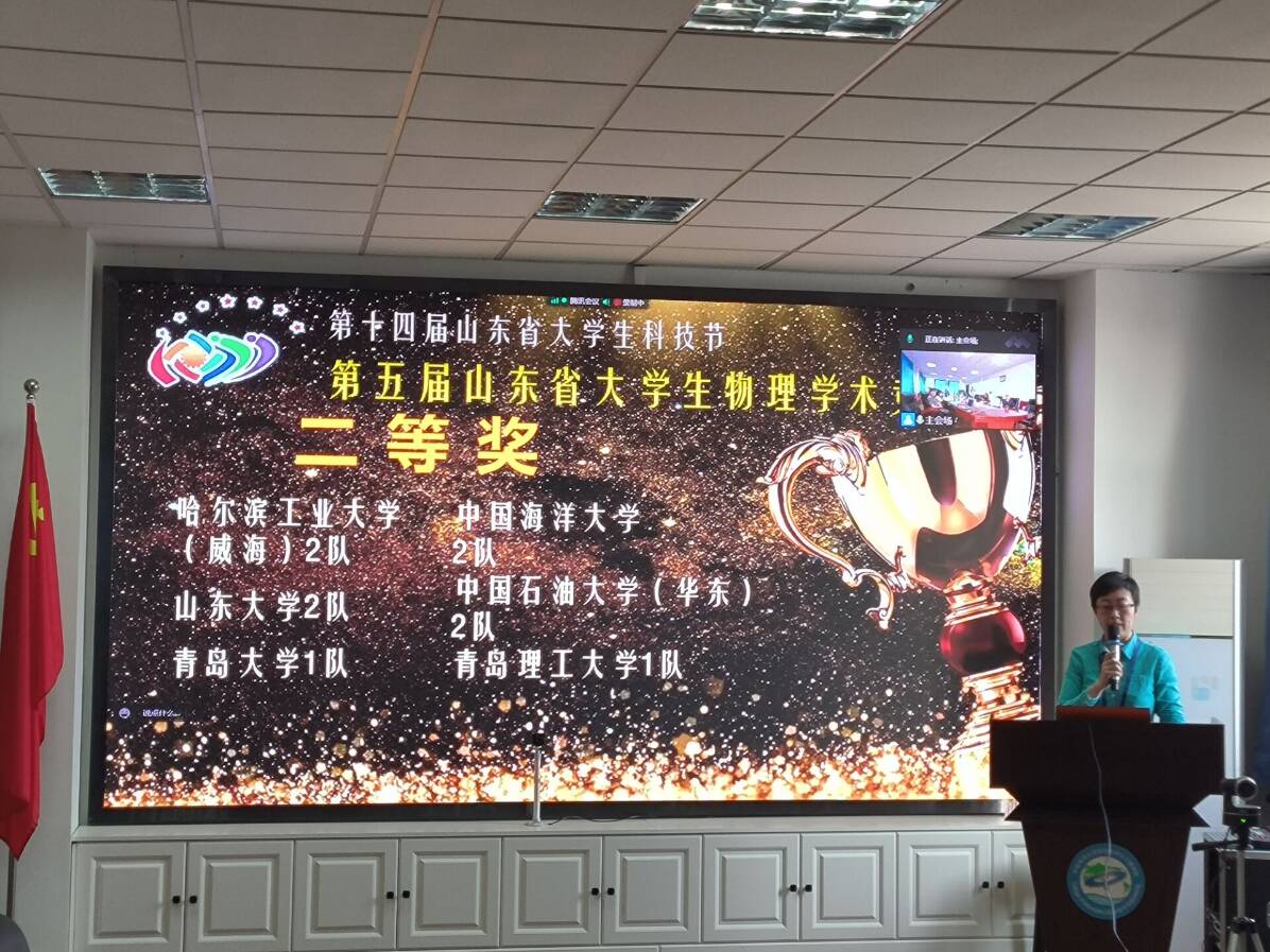 6月3日,第五届山东省大学生物理学术竞赛(CUPT)如期开幕,理学院党委副书记、院长马鸿洋出席大赛开幕式,物理教研室陈立波副教授、谯洁老师受邀为裁判组成员。我校理学院派出两支代表队,与来自山东大学、中国海洋大学、中国石油大学、哈尔滨工业大学(威海)等十余所高校的学生同台切磋竞技。经过指导教师和参赛队员长达半年积极备赛和现场的出色表现,两支队伍最终取得省级二等奖1项,省级三等奖1项,物理201班刘尚昀同学获“最佳反方辩手”称号,创造了我校在此项竞赛中的历史最好成绩。