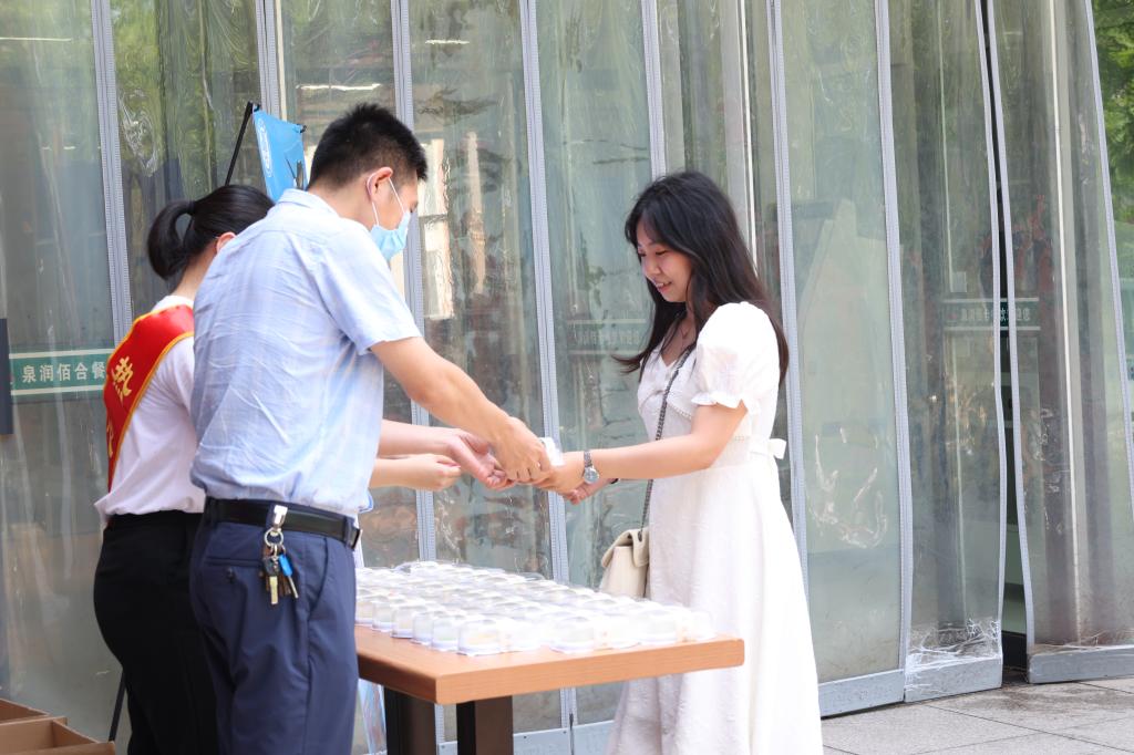 活动现场,各学院辅导员及后勤管理处饮食管理服务中心的工作人员一起微笑着将包装好的近万份绿豆糕礼品送到每一位毕业生手里,毕业生们接过绿豆糕,激动之情溢于言表。