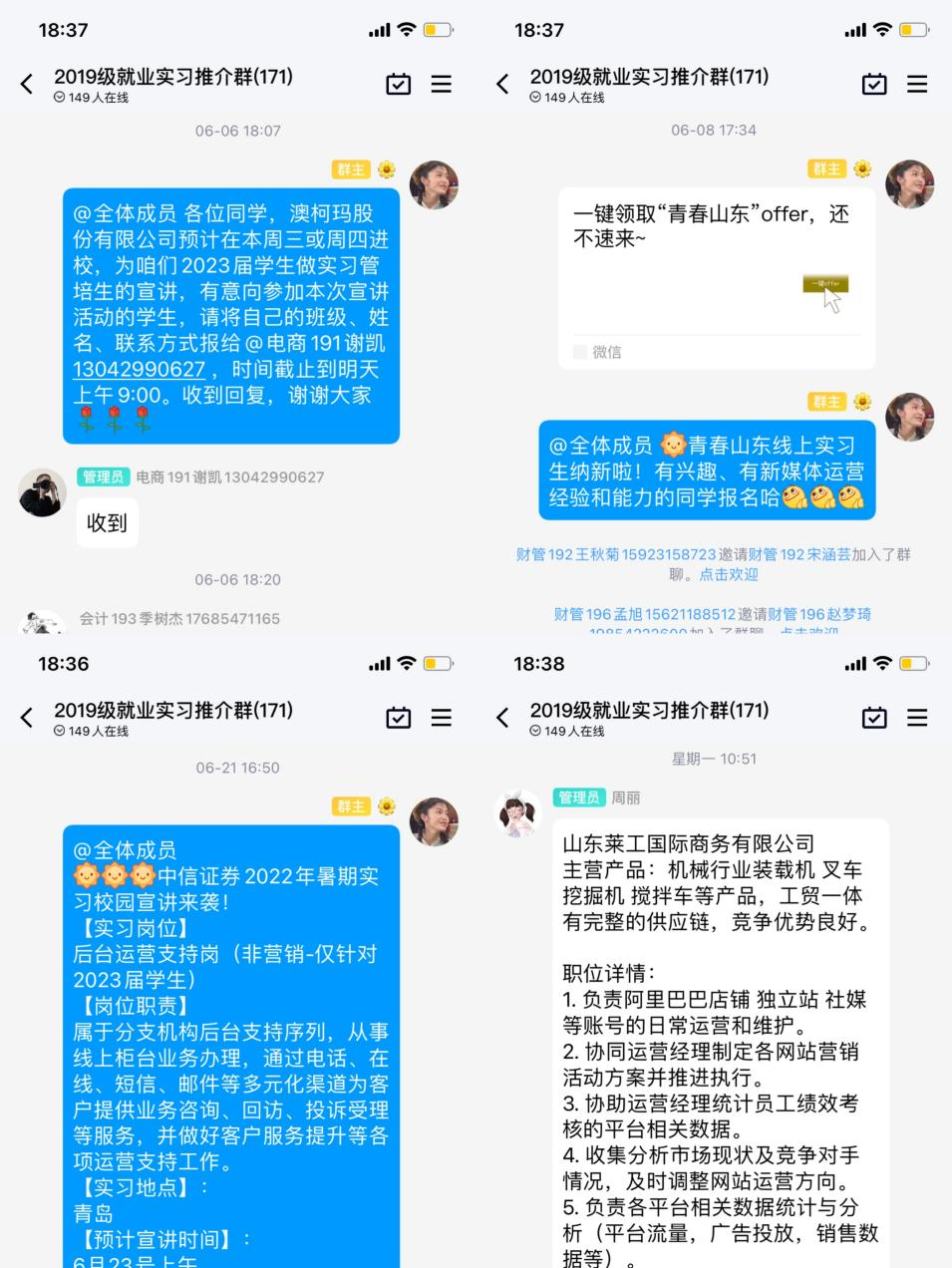 渠道拓展,搭建就业信息平台。“老师,我收到澳柯玛公司的实习通知啦!咱们的就业推介群太有用啦!谢谢老师!”电商191班谢凯在收到实习通知后第一时间与辅导员老师们分享。为做好2023届毕业生就业服务指导工作,商学院通过线上方式创建“就业推介群”、线下方式“就业小喇叭”,积极搭建信息互通平台,线上线下同步推进,将有关就业实习的相关信息进行宣传,提高就业见习工作知晓度,扩大见习覆盖范围,并根据学生具体实际情况一对一开展就业实习服务工作,进一步帮助实现学生高质量就业。