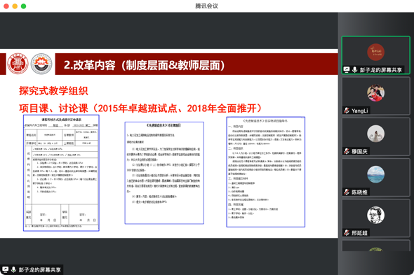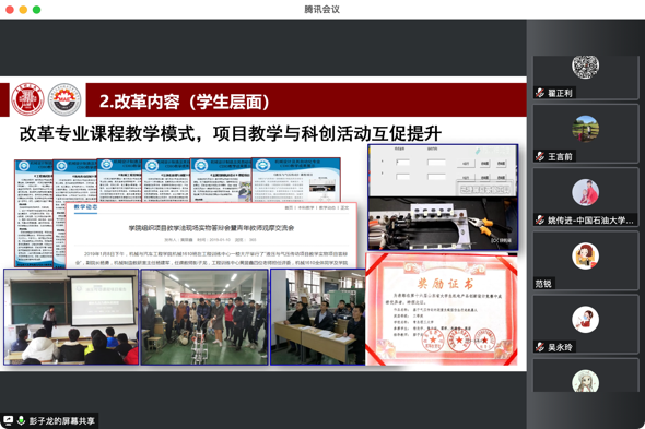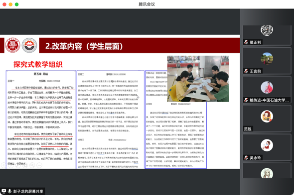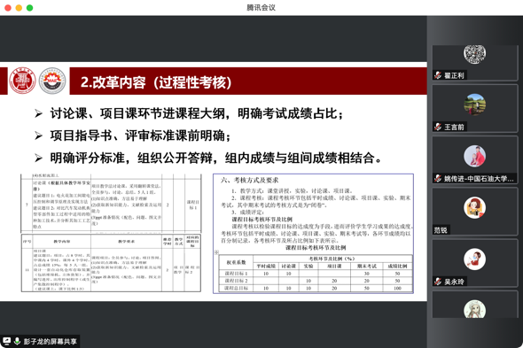 姚传进通过在线会议的方式结合石油工程学院的课堂教学改革经验从学院的管理机制、课程群的设置、过程考核的实施举措、专业课构建“大思政”的探索等方面做了分享。