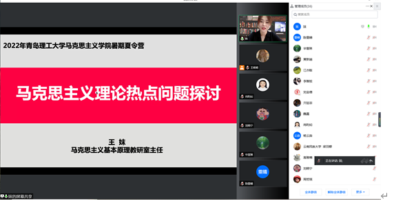 随后,马克思主义基本原理教研室主任王妺向营员分享并共同探讨了马克思主义理论热点问题,主要涉及当前为学界普遍关注、正在热烈讨论并有待深化的一些理论命题和重要论断,讲座深入浅出、内容丰富、视野开阔,令营员们深受启发、获益匪浅,同学们反响热烈。