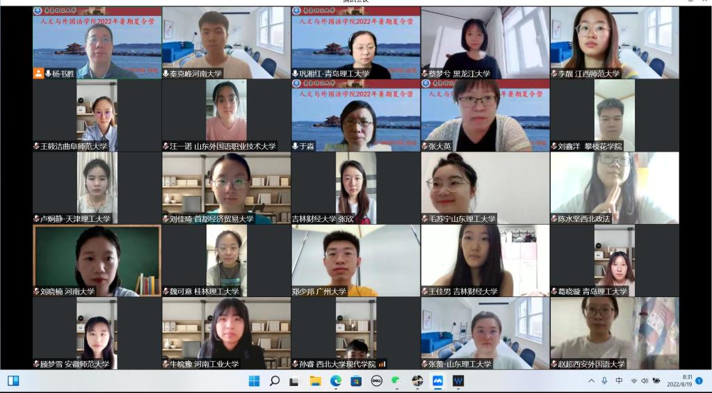 8月19日-20日,人文与外国语学院2022年大学生暑期夏令营顺利举行。本次夏令营通过线上方式举行,共有开营仪式、专业宣讲、学术讲座、优秀营员评选四个环节,来自郑州大学、广州大学等32所高校的53名同学参加。