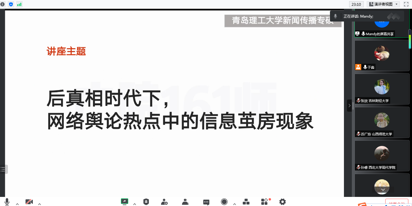 下午,网络与新媒体专业教研室主任常宁、翻译硕士教育中心主任张大英、副院长杨书胜分别作了《后真相时代背景下网络舆论热点中的信息茧房》《中华学术外译中的古汉语资料英译问题》《五社联动:发展历程、内涵与实务应用》的学术讲座。
