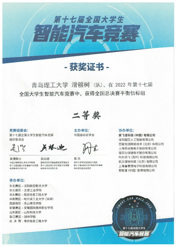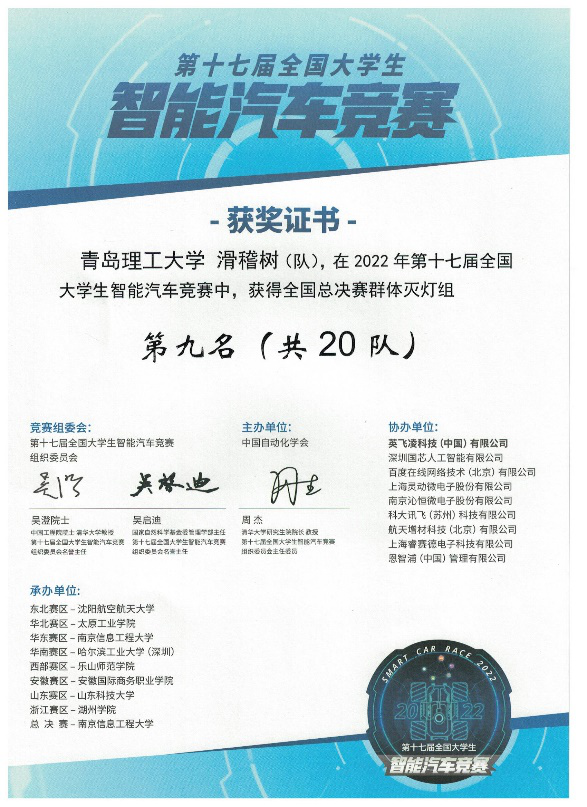 近日,2022(第十七届)全国大学生智能汽车竞赛全国总决赛在南京信息工程大学落下帷幕。包括清华大学在内的200余所高校515支队伍闯进全国总决赛,经过激烈的角逐,信息与控制工程学院参赛学生团队再创佳绩,荣获平衡信标组二等奖1项,群体灭灯小组第九名(共20队)。在此前结束的全国大学生智能汽车竞赛(山东赛区)的比赛中,我校代表队共获得山东省一等奖1项、二等奖7项、三等奖5项的优异成绩。
