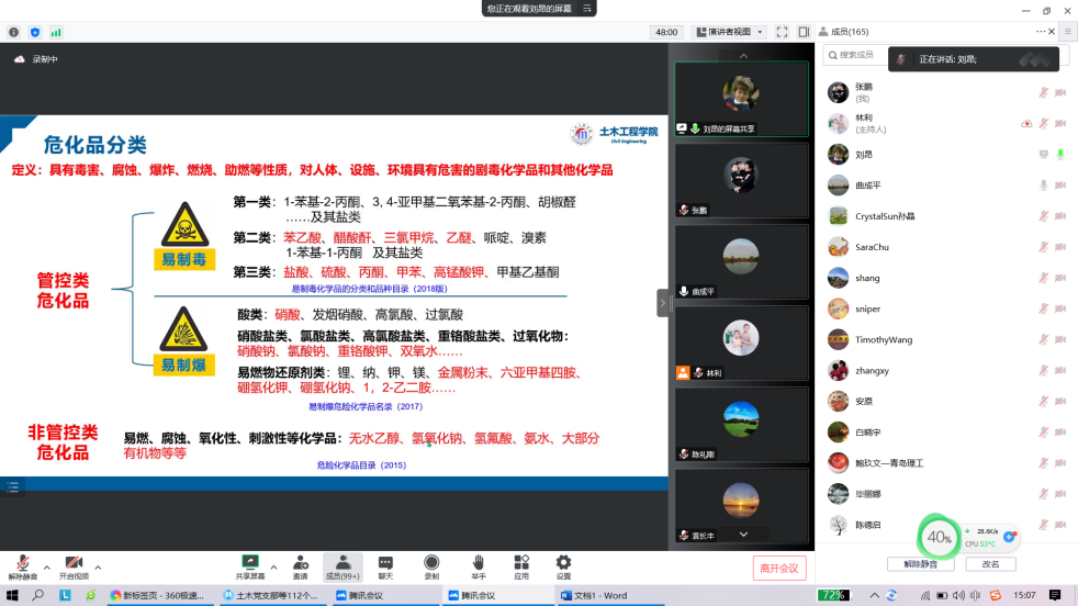面向全院研究生开展安全规范使用实验室线上培训。10月12日,学院举办了关于安全规范管理和使用实验室的线上专题培训会,邀请山东科技大学实验室管理处副处长王鹏作报告,学院院长侯东帅、副院长张鹏出席会议。培训报告以部分实验室安全事故为例,详实讲解了如何做到实验室安全规范管理,如何做好实验室安全防范及应急处置工作。本次培训会通过案例式教学,切实提高了广大师生的实验室安全管理意识。