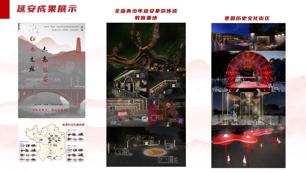 “筑梦延安”实践团在2022年暑假前往革命圣地延安,在校团委的指导下,开展了为期10天的全国大学生暑期“三下乡”延安社会实践专项活动。实践团队成员深入了解了延安的红色文化背景,感悟了解放思想、实事求是的延安精神,并充分发挥专业特长,为基地及枣园历史文化街区夜间光环境优化提出了一系列可行的措施,设计了多种展现延安红色文化的夜景观装置,推动了延安红色文旅夜游进一步发展。团队实践成果多次获国家级、省市级媒体报道,在光环境领域斩获荣誉奖项。