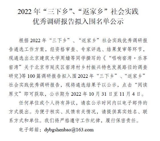 近日,共青团中央2022年“三下乡”、“返家乡”社会实践优秀调研报告拟入围100篇名单公示,经资格审查、专家评选、结果复审等环节,我校建筑与城乡规划学院于红霞教授、杨霈宣老师指导、秦芷琼等6位同学共同撰写的主题调研报告《关于延安枣园历史文化街区红色文旅夜景观创意设计的调查研究》成功入选。