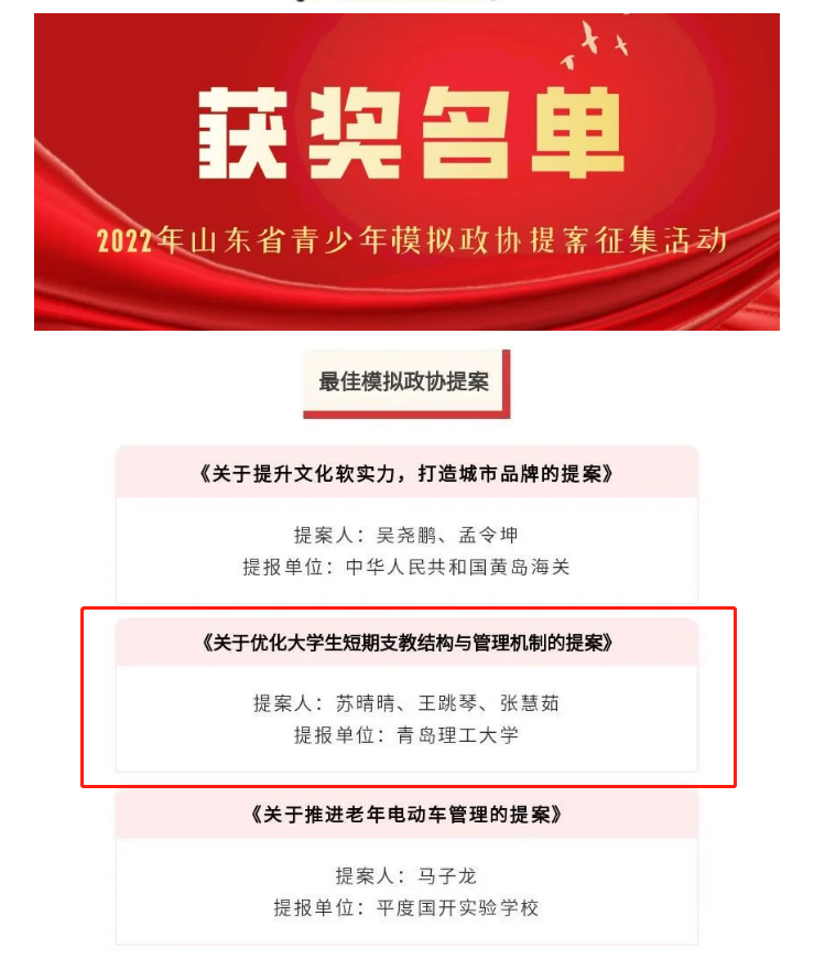 近日,由团省委、省学联联合开展的2022年山东省青少年模拟政协提案征集活动评审结果揭晓,在全省1.28万提案作品中,经过学校推荐、团省委初审、专家评审等环节,最终30件作品获评“最佳模拟政协提案”,其中大学组13件。我校管理工程学院苏晴晴、王跳琴、张慧茹等同学撰写的《关于优化大学生短期支教结构和管理机制的提案》在众多作品中脱颖而出,是驻青高校中唯一获评“最佳模拟政协提案”的作品,将被推荐参加全国评审的作品。宋晓峰获评优秀指导老师。