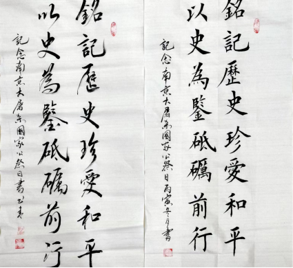 师生自发设计了海报,号召铭记惨痛历史,勿忘国耻,反对战争,捍卫和平,不忘初心,发愤图强,为实现中华民族伟大复兴贡献青春力量。辅导员殷宗华用毛笔写下了“以史为鉴砥砺前行,铭记历史珍爱和平”,激励广大青年不忘来时路,坚定走好脚下路。