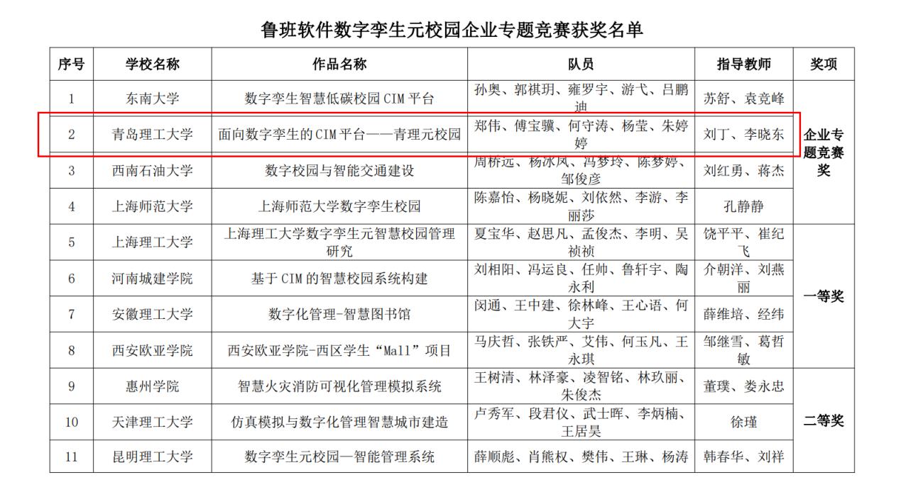 总决赛共分为5个云答辩室同时进行。其中,鲁班软件数字孪生元校园企业专题竞赛共41支队伍参加,经过校级初赛、全国复赛,选出来自全国16所院校的参赛团队进行总决赛的角逐,最终评选出企业专题竞赛单项奖4项作品、一等奖4项作品、二等奖8项作品、三等奖12项作品、优秀奖13项作品。我校管理工程学院刘丁老师、土木工程学院李晓东老师共同指导的参赛作品《面向数字孪生的CIM平台——青理元校园》收到评审专家的一致认可,获得企业专题竞赛奖。该作品搭建了校园信息模型(CIM)平台,运用无人机倾斜摄影建立GIS模型,Revit搭建校内建筑BIM模型,将校园基础地理信息、建筑信息模型和其他三维模型汇集、转换、轻量化处理、多场景融合及可视化表达,团队致力于将数据还原于场景,使场景赋予数据真实意义,以助力未来数字孪生智慧校园的发展。