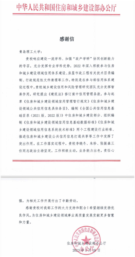近日,青岛理工大学收到住房和城乡建设部办公厅发来的感谢信,对学校在2022年住房和城乡建设领域信用体系建设、行政规范性文件清理和房屋市政工程有关技术目录编制等工作中做出的积极贡献表达感谢。尤其对学校城乡建设信用和风险管理研究团队在信用体系建设中发挥的智库作用予以肯定,对管理工程学院李晓冬副教授、张振森副教授及土木工程学院朱珍老师在相关工作中表现出的精湛业务能力和积极工作态度予以表扬。