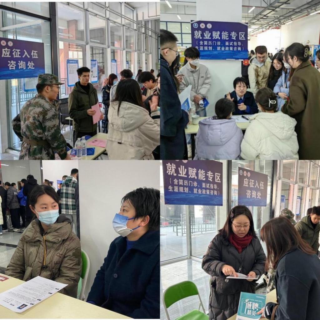 暖心服务保障,努力提升就业加速度。招聘会现场设置了专门的人才政策解读区、征兵政策宣讲区,为学生细心解读相关政策。场地中还有一个异常火爆的摊位——就业赋能区,负责对学生进行简历指导、生涯规划引导等,招聘会期间接待学生三百余人次。大学生心理健康教育中心杨波、薛腾飞老师用三维定位法等帮助同学们从多个维度摸索自己适合的职业方向,注入职业定位的“清醒剂”。各学院就业辅导员也纷纷来到招聘会现场,和企业HR们沟通用人需求,现场精准荐才,切实为毕业生就业做好后方保障。