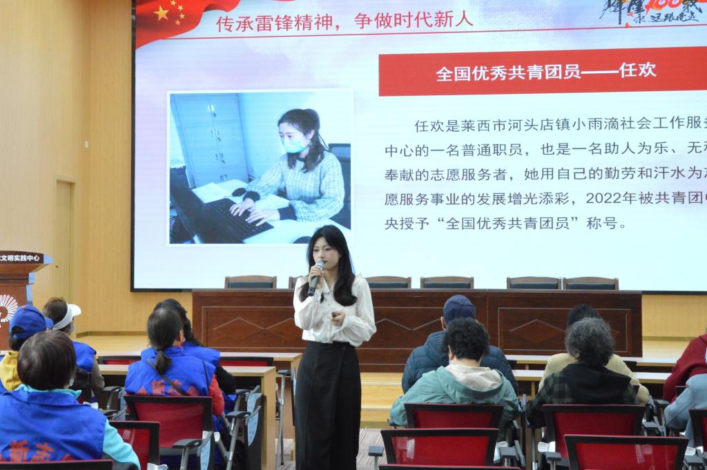 为贯彻落实习近平总书记关于弘扬雷锋精神、深入开展学雷锋活动的重要指示精神,进一步引导基层社区工作者学习雷锋精神,推动学雷锋活动融入日常、化作经常,3月10日下午,学校理论宣讲团一行4人走进浮山新区街道为30名优秀社区工作者开展了以“雷锋精神我传承,青春闪耀新时代”为主题的宣讲活动,宣讲团成员景宗鹤、蒋维主讲。