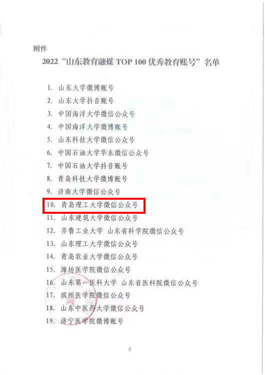 近日,山东教育融媒体联盟公布了2022“山东教育融媒TOP100优秀教育账号”推选结果,“青岛理工大学”微信公众号入选。