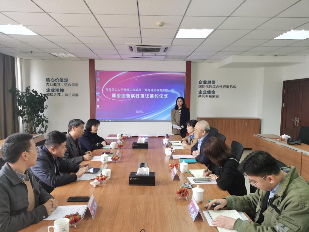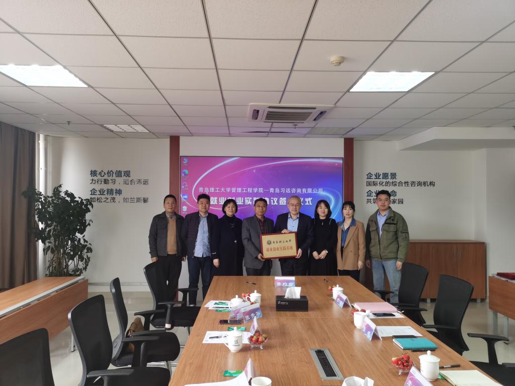 为更好地凝聚校友力量,增进校友与母校的情感,迎接学校70周年校庆, 3月21日,管理工程学院走访青岛习远咨询有限公司并举行就业创业实践基地签约仪式。学院党委书记李洪民,党委副书记、副院长王中帅,工程造价系主任张贵华,毕业生辅导员李佳妮、张冯冯参加。并与习远咨询公司董事长张晓,学院04级国工专业校友、副总经理李璐晓等进行座谈。