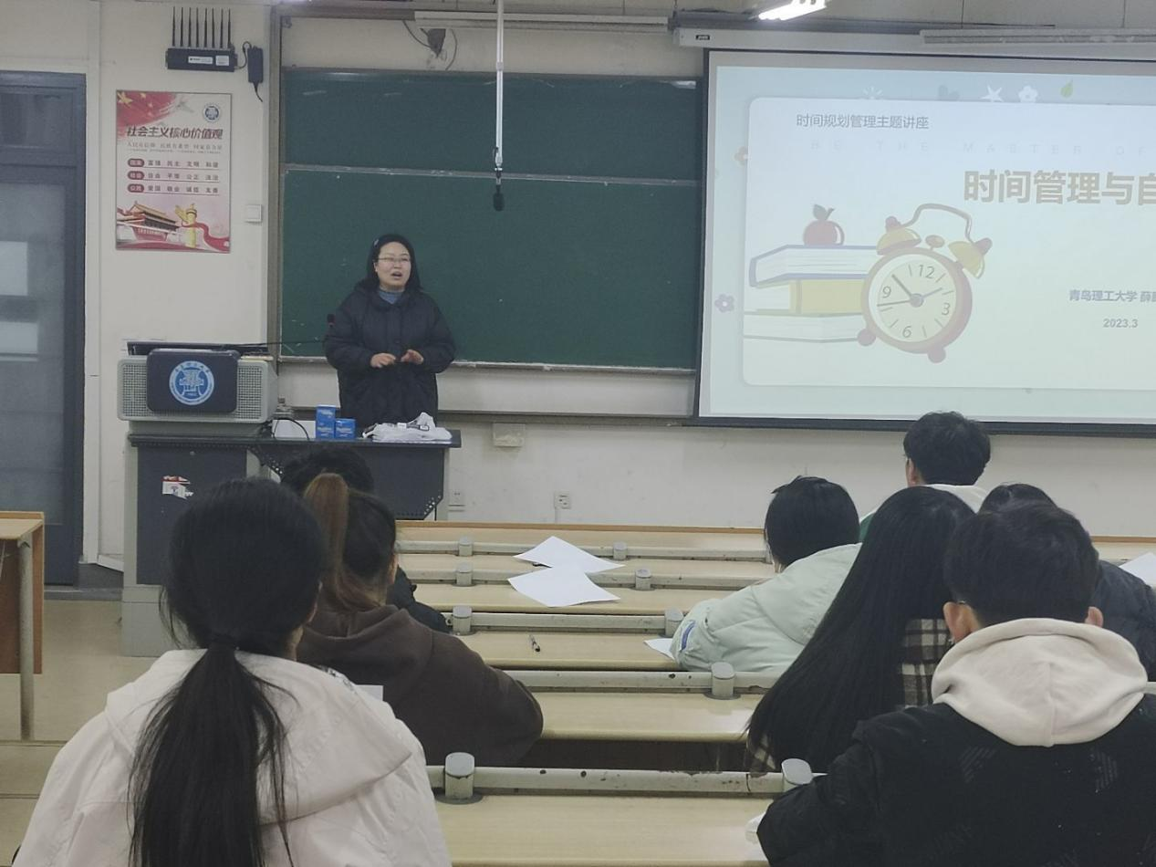 3月23日下午,学院在嘉陵江路校区主教学楼B232教室举办主题心理健康主题讲座,讲座邀请学校心理健康教育中心薛腾飞老师担任主讲人,来自理学院各年级的60余名同学参加讲座。活动中,薛腾飞以“心存时间,只争朝夕”为题,用生动幽默而又专业的语言引导同学们从时间管理和目标规划的角度出发关爱自己的身心健康,成为一个忙碌又充实的快乐学子。讲座现场以师生互动的模式开展,同学们首先通过心理小测试对自己的整体情况有所了解,然后把心中的困惑问题写到纸上进行分享提问,薛腾飞逐一回应同学们的问题并提出了5种帮助同学们管理生活的方法,同学们在互动参加中直观而深刻地感受到学习科学生涯规划和时间管理的重要性。
