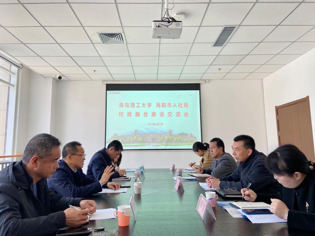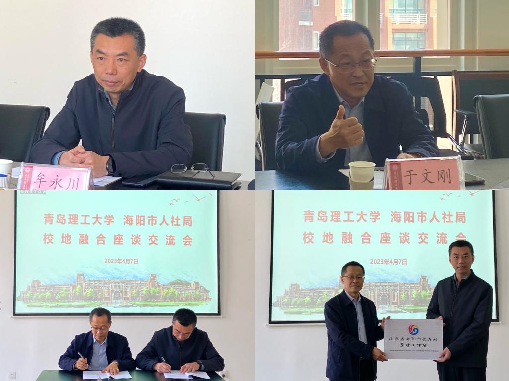 座谈会上,牟永川首先代表学校对海阳市人力资源和社会保障局一行到来表示热烈欢迎,并从学校办学特色、人才培养、2023届毕业生生源分布情况等方面进行介绍。牟永川表示:“政校企三方聚力有利于实现人才、技术和项目的精准供需对接,实现多方共赢。希望通过此次座谈进一步强化校地、校企合作,与海阳市共同走出政校企合作新路子。”于文刚从核电、风电、航天等海阳市国家战略发展重点项目情况、人才需求、人才政策等方面介绍了海阳市产业发展状况,并提出依托学校和企业资源优势开展深入合作,吸引学子们来到海阳创新发展,共同打造城市与人才高质量发展“共赢”之路的衷心期盼。热切交流过后,双方就加强人才引进工作、开展深度交流合作达成了共识,签署海阳驻青岛理工大学引才工作站协议并进行授牌。