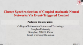 4月4日,周武能教授以神经网络的基础生物神经元为切入点,通过对比事件触发与时间触发采样机制,介绍基于事件触发控制的神经网络模型,引入集群同步。设计新的事件触发控制器,借助Lyapunov稳定性定理和M-矩阵方法,给出带有高斯白噪声和Lévy过程的随机系统同步控制。