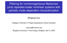 4月3日,华民刚老师介绍部分模态相关特征的非齐次马尔可夫跳跃重复标量非线性系统的鲁棒滤波问题。利用正定对角最优矩阵分析系统的随机稳定性。提出一种新的部分模态相关的鲁棒滤波器,通过构造Lyapunov泛函方法,给出滤波器的存在条件。