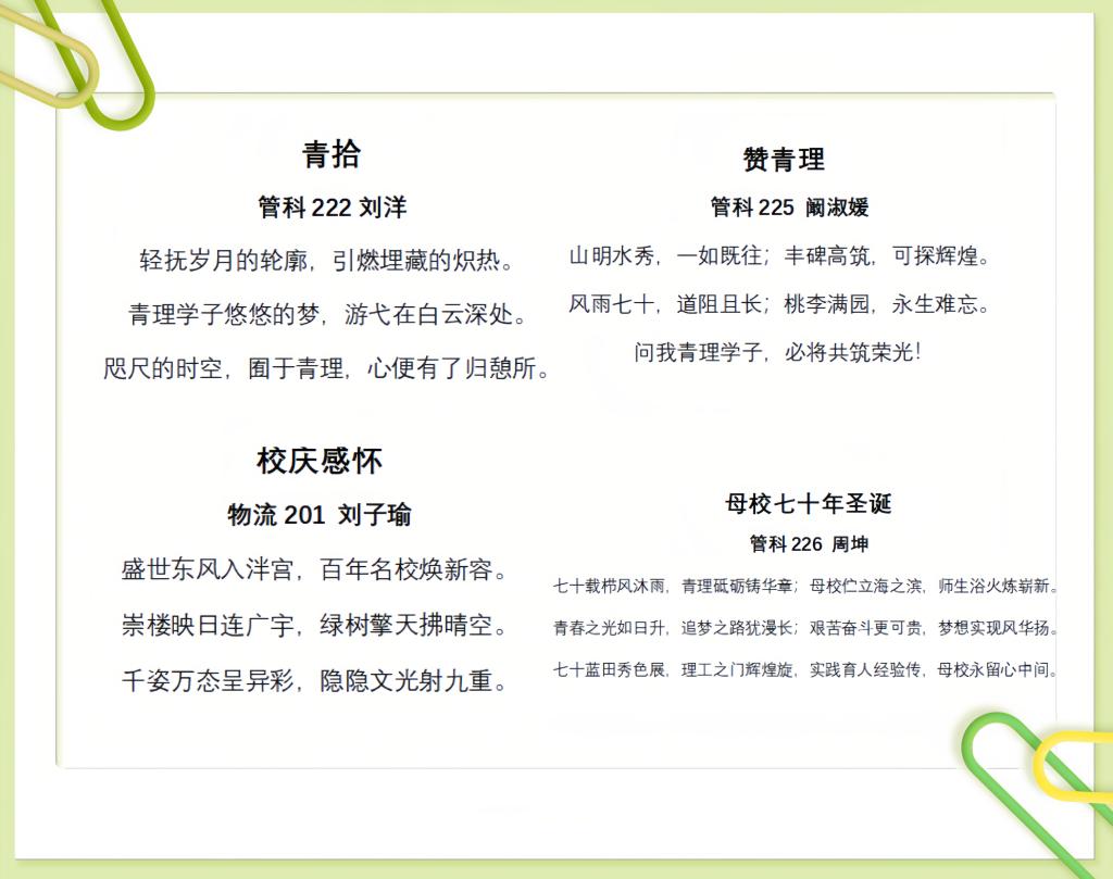 学院学子踊跃参与,陆续提交了五十余个作品。他们用心写下的一首首短小精悍的校园情诗,或记录丰富多彩的校园生活,或表达对母校的浓浓心意,皆是青理学子积极向上的精神面貌最好的展现,更是青理深厚的历史文化底蕴最好的体现。本次诗歌征集活动,加深了同学们对学校历史发展与文化底蕴的认识,激发了广大师生爱校、荣校、兴校的情怀,激发了同学们的创作能力。