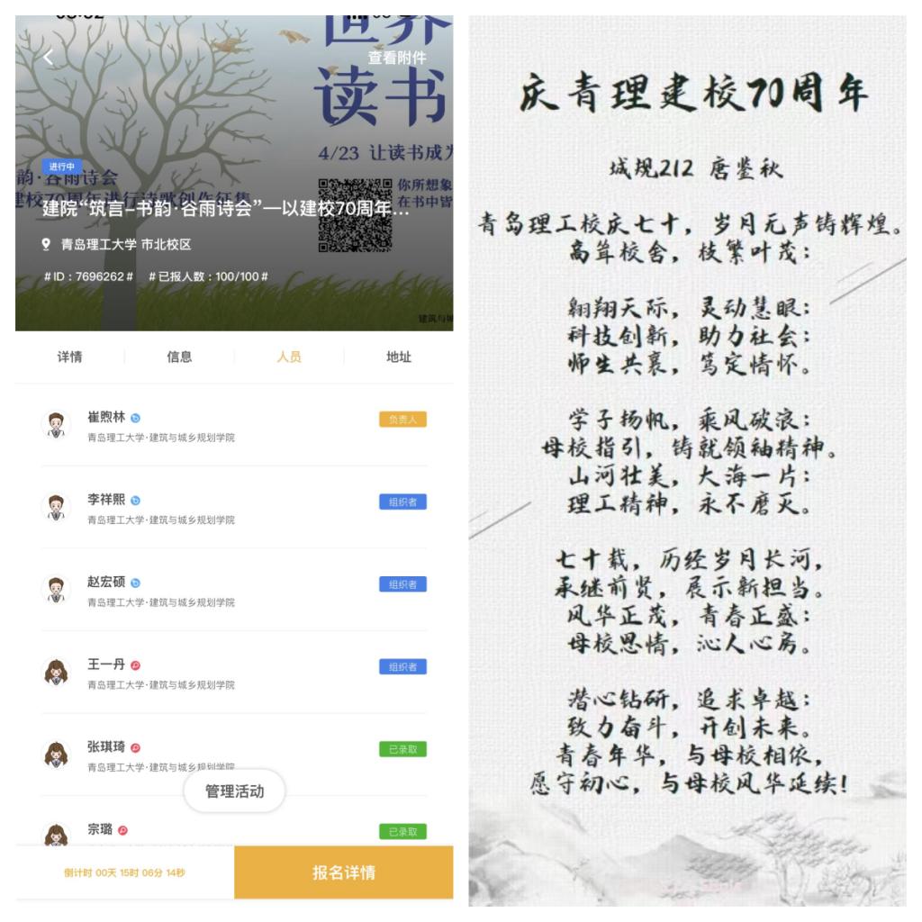 原创诗歌征集,礼赞建校70周年。值此建校70周年之际,学院开展了诗歌征集活动,吸引了大家的热情关注、踊跃参与,共征集学生作品百余篇。同学们的作品感情真挚,语句精彩,字里行间传递着对母校的感恩与祝福,体现着青年学子蓬勃向上的精气神。“七十载,历经岁月长河,承继前贤,展示新担当。风华正茂,青春正盛;母校恩情,沁人心房。”城规212班唐鉴秋在《庆青理建校70周年》中写道。