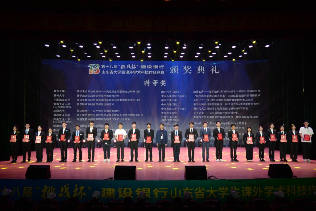 5月22日上午,由共青团山东省委、山东省科学技术协会、山东省教育厅、山东省科学技术厅、山东社会科学院、山东省学生联合会主办,齐鲁工业大学(山东省科学院)、潍坊职业学院承办的第十八届“挑战杯”·建设银行山东省大学生课外学术科技作品竞赛决赛在齐鲁工业大学(山东省科学院)落下帷幕。我校学子获得山东省特等奖1项、一等奖5项、二等奖2项、三等奖4项,学校获“优秀组织奖”。