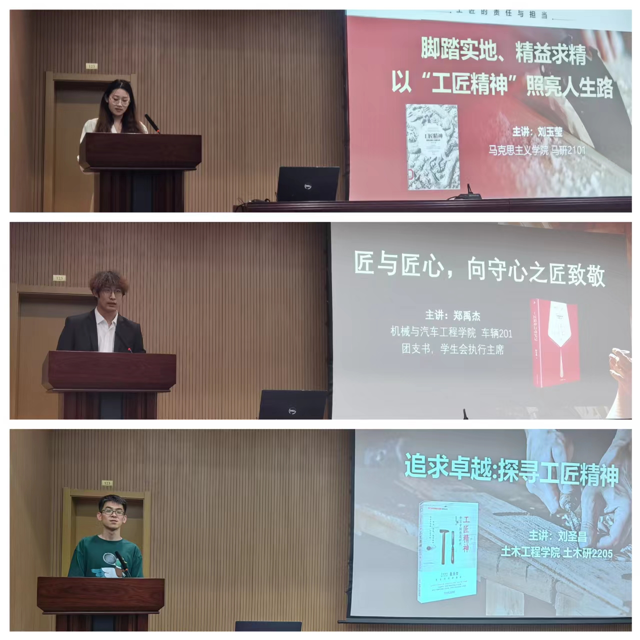 马克思主义学院刘玉莹、机械与汽车工程学院郑禹杰、土木工程学院刘圣昌分别以《脚踏实地、精益求精:以“工匠精神”照亮人生路》《匠与匠心,向守心之匠致敬》《追求卓越:探寻工匠精神》为主题作了读书分享。
