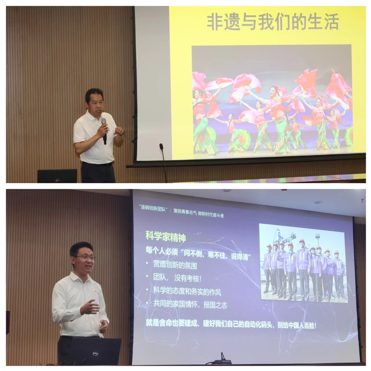 在“书香思政·工匠精神”讲座与读书分享环节,青岛大学教授、青大非遗中心负责人侍锦老师,和“全国青年岗位能手标兵”、山东港口青岛港“时代楷模”“连钢创新团队”骨干成员张常江作为主讲嘉宾作讲座。侍锦以《非遗与我们的美好生活》为主题分享了青岛地区的手造资源和群众基础,通过校园推广让更多年轻人了解手造文化和非遗文化,感受“中国智慧、中国价值、中国精神”。张常江以《激扬青春志气 做新时代奋斗者》为主题介绍了“连钢创新团队”,分享了坚定理想信念、成长成才的一线师傅,突围破壁、自主创新的自动化码头,为在场学生展示了“中国制造、中国速度、中国方案”。