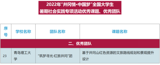 6月16日,由团中央青年发展部、全国青少年井冈山革命传统教育基地管理中心于2022年暑期组织开展的“井冈情·中国梦”全国大学生暑期社会实践专项活动实践成果评选圆满结束。由校团委指导,建筑与城乡规划学院教授于红霞,学院团委书记杨霈宣,辅导员朱华建带队的“筑梦寻光·红旅井冈”团队获共青团中央“井冈情·中国梦”全国大学生暑期社会实践活动优秀团队称号。