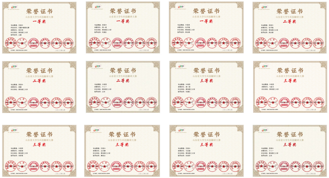 近日,第十五届山东省大学生科技节科技翻译大赛获奖名单公布,人文与外国语学院英语221班周一诺、日语202班张书瑄分别获英译中组、中译英组一等奖,日语211班荆文硕获日译中组一等奖,英语221班丁小丫、201班高静分获中译英、英译中组二等奖,日语202班卢韩静获日译中组二等奖,英语201班吕雪倩、221班周一诺、201班马逸飞获中译英组三等奖,英语221班丁晓丫获英译中组三等奖,日语211班马宝骏、王艺豪获日译中组三等奖。