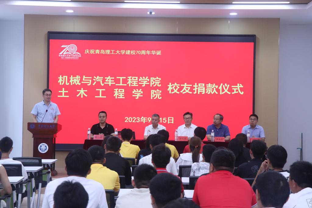 9月15日下午,机械与汽车工程学院、土木工程学院校友捐款仪式在黄岛校区C1-3-104会议室举行。原青岛建筑工程学院冶金机械专业1994届校友、北京城建北方集团有限公司副总裁、北京城建北方德远实业有限公司总经理郭建敏,原青岛建筑工程学院工民建专业1997届校友、北方德远实业有限公司副总经理张文昌参加仪式。原土木工程学院党委书记曲成平教授、机械与汽车工程学院党委副书记董虎、学工办主任兼团委书记王成,部分师生代表共同参加。捐款仪式由机械与汽车工程学院党委书记李忠晓主持。