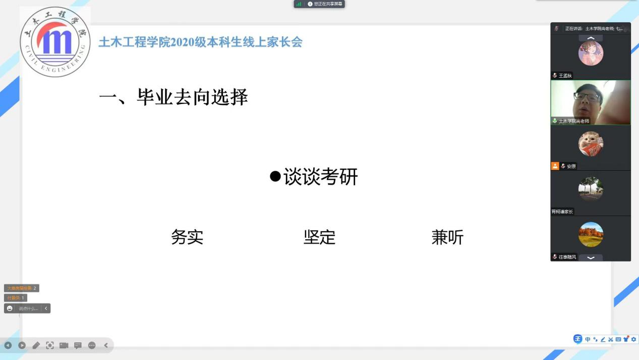 开学初,学院开展2020级本科生“考研护航”线上家长会,为大四学生家长们答疑解惑。会议邀请了2019级本科生辅导员尚洋洋分享经验,他结合自己刚指导完毕业生考研的经验,以“务实、坚定、兼听”为主题,为家长们带来一场精彩报告,解答了家长最想了解的考研问题。父母是考研学子最坚实的臂膀和后盾,家长的陪伴和鼓励能够事半功倍地为他们提供前行的力量。此次家长会增进了家校联结,提前与家长沟通,让家长清楚考研学子们面临的挑战和压力,帮助家长明晰护航学生考研的努力方向,形成家校合力,共同为学生的考研之旅保驾护航。